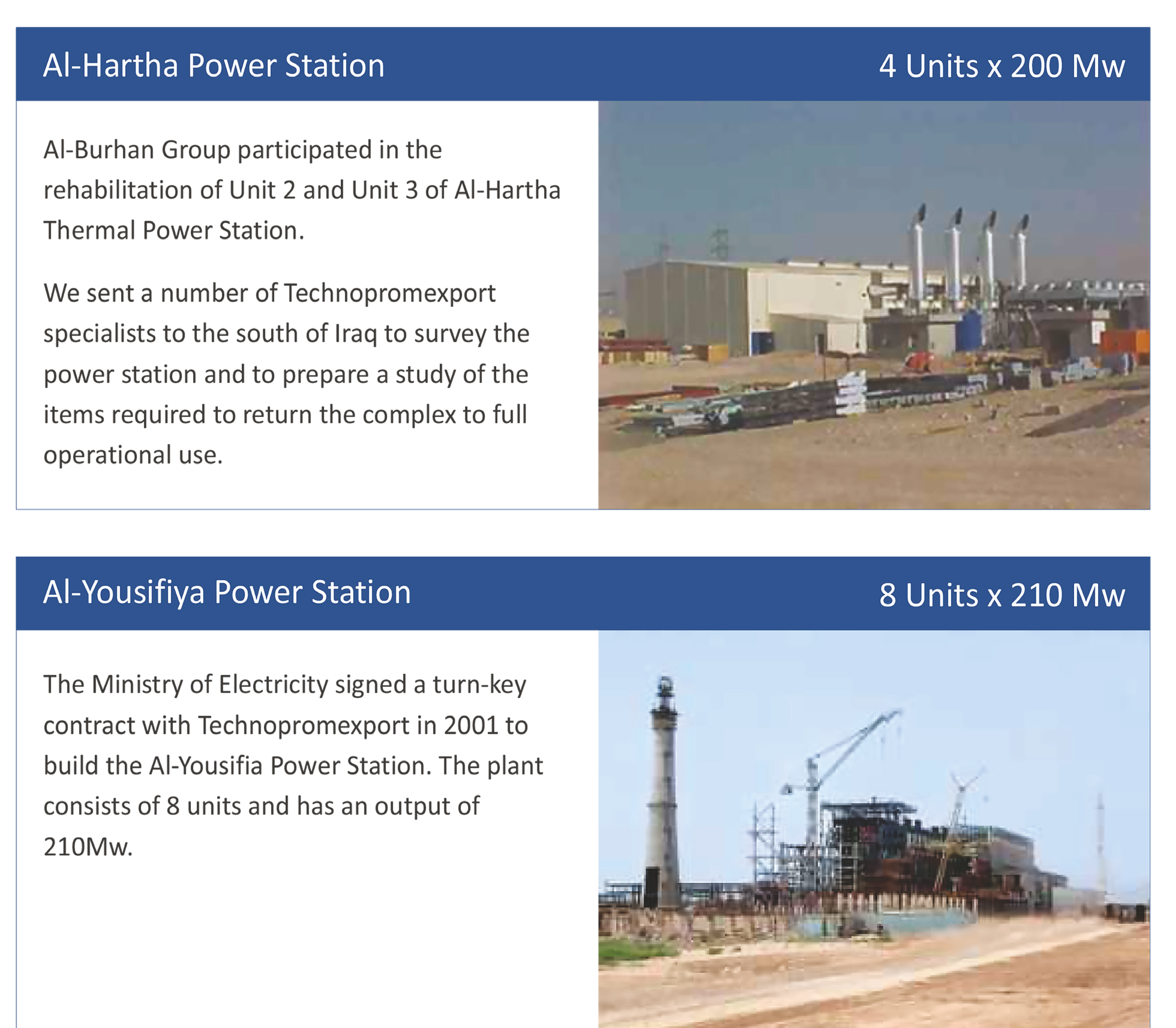 Al-Burhan Group is active in the field of electrical equipment delivery, construction and supply. AlBurhan Group is working in partnership with Technopromexport, a constructor and exporter of power. It is partnerships like this that allow the Group to help restore power